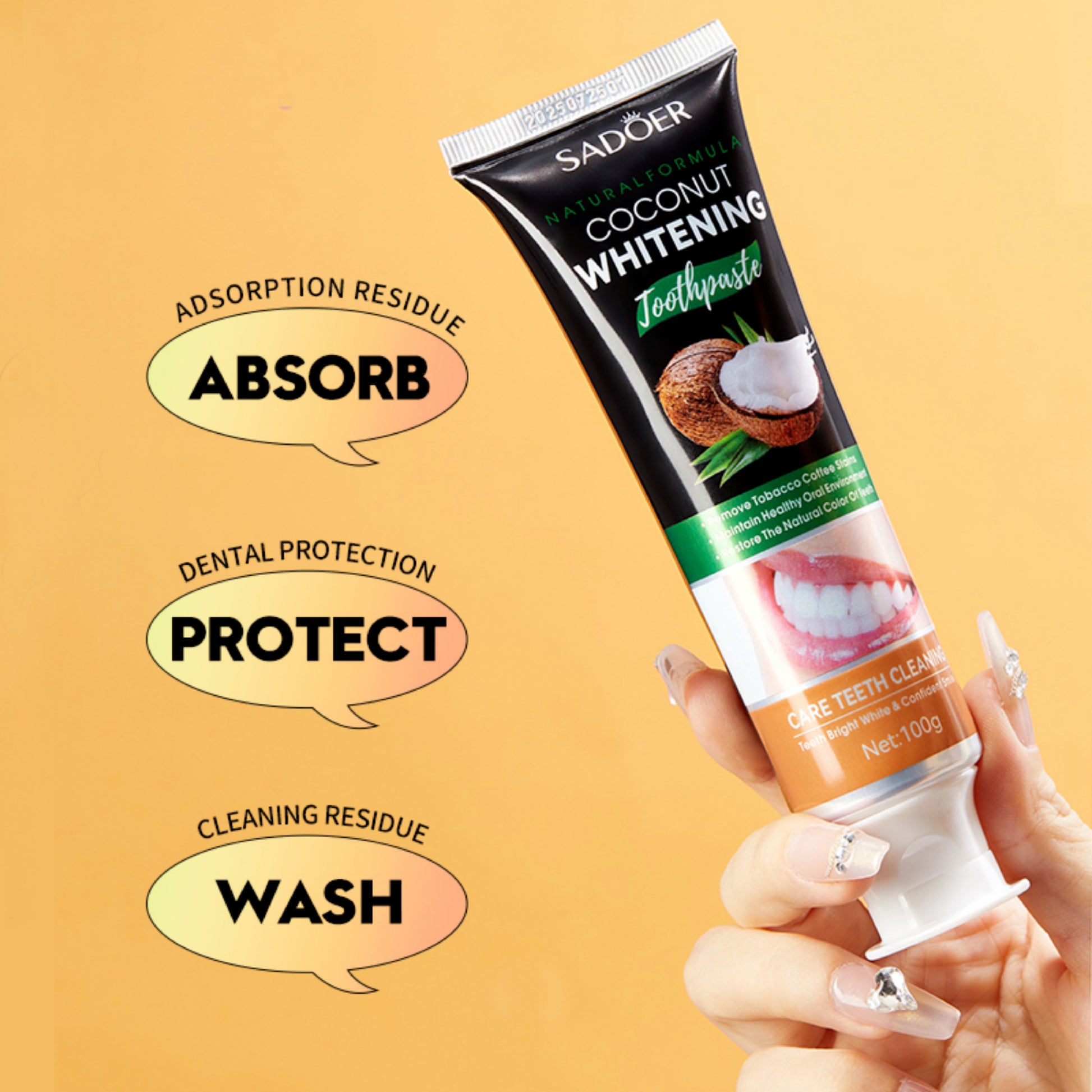 Sadoer Coconut Whitening Toothpaste is a refreshing oral care solution infused with natural coconut extract. It gently whitens teeth, helps remove surface stains, and promotes overall oral hygiene. The formula supports healthy gums while delivering a clean, tropical coconut flavor that freshens breath. Ideal for daily use to achieve a brighter, healthier smile naturally.